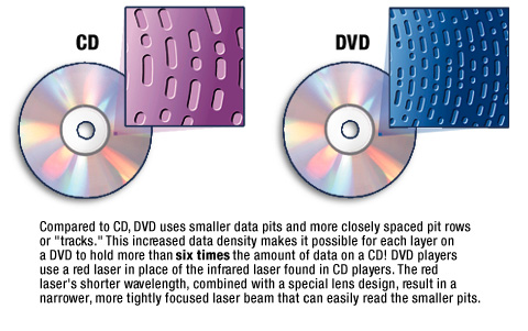 In essence a combination of smaller pits etched into the disc, improved laser reading, double layered (whereby the laser skips between the top and bottom layer) and double-sided discs has increased the storage capacities over a standard CD-ROM by over 400%